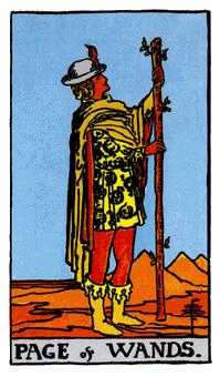 The Page of Wands is a messenger, out to enjoy life and begin something – maybe an adventure. There is massive potential here. Because everything is new and fresh, the new beginning gives them the energy to be eager and excited. Certainly, they are ready to commit to something – their first adventure maybe?
