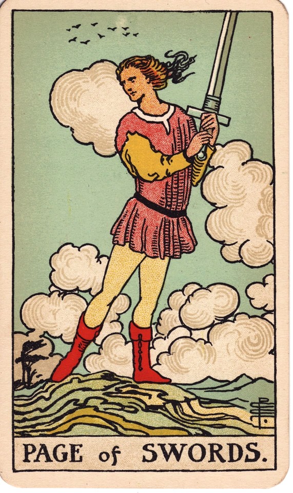 The Page of Swords is talkative – asking many questions – mostly beginning with “Why?” Good reading and writing skills go with the questions. The Page seeks continually guidance. As the Page does this, they seem to be older than the child they are. Two things: The Page of Swords, as young as they are, likes truth and revenge.